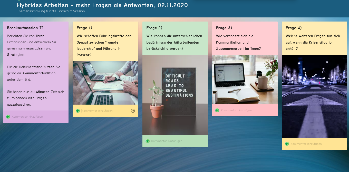 Nach einem kurzen „Warming-Up“ in kleinen Breakout-Sessions wurde schnell deutlich, dass nach längerer Zeit des digitalen Austausches vor allem die „echten“ sozialen Kontakte fehlen. In Form von digitalen Meetups, Konferenzen oder auch virtuellen Kaffeepausen lässt sich die räumliche Distanz zwar teilweise überbrücken, allerdings gibt es auch viele Formate, die nicht ohne weiteres in ein Online-Format umgewandelt werden können. Als Beispiele werden Veranstaltungen zum Onboarding neuer Mitarbeiter/-innen oder auch Feste und Weihnachtsfeiern genannt.